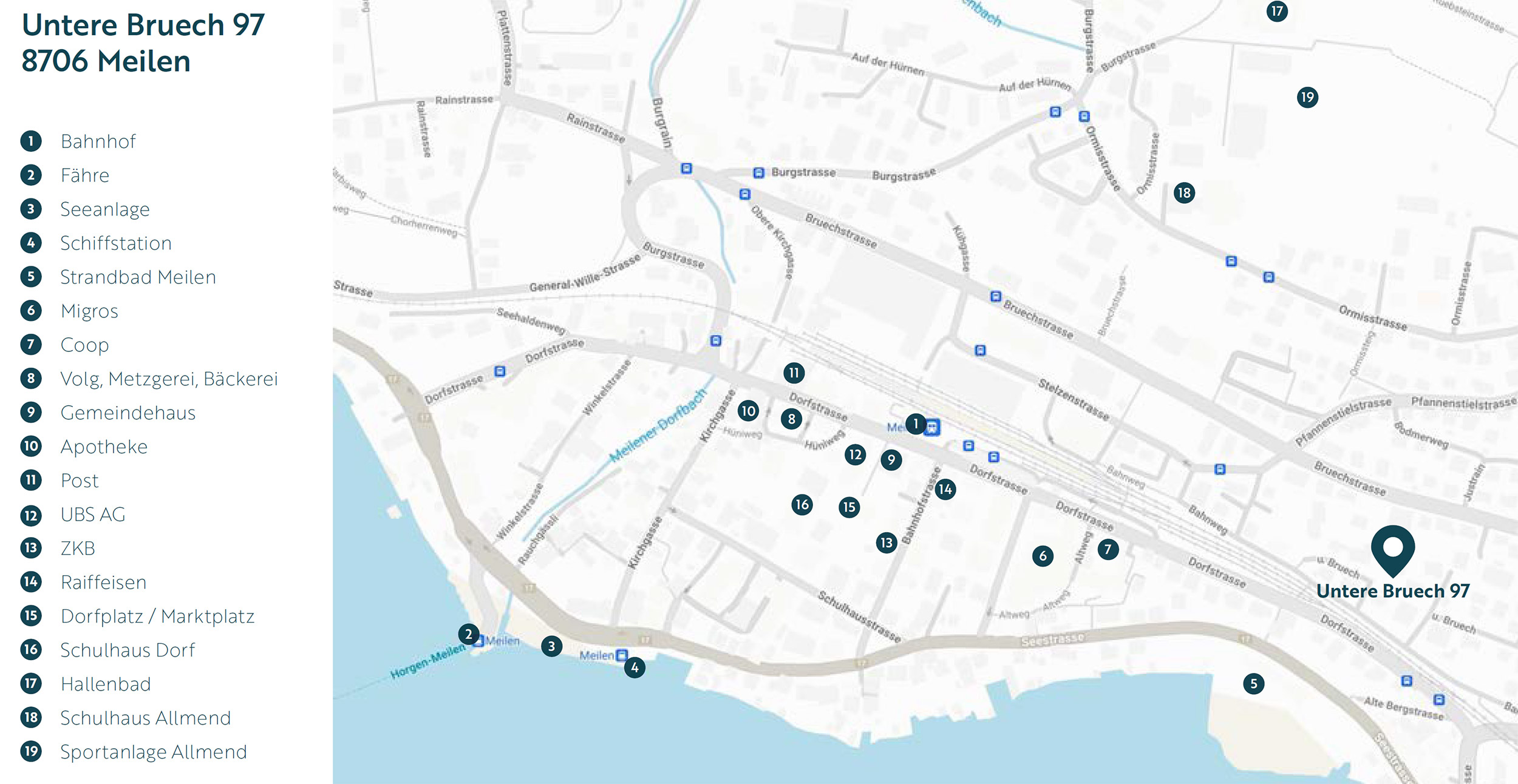 In einem bevorzugten Wohnquartier an bester Südhanglage mit Sicht auf den Zürichsee, an der Unteren Bruech 97, entsteht Mia Meilen. Die optimal ausgerichteten Wohnungen bieten viel Licht und Privatsphäre. Einheimische Pflanzen, Rankstrukturen und Natursteinmauern erinnern an die frühere Nutzung als Weinberg und verleihen dem Ort einen besonderen Charakter. Mit der Umsetzung der genehmigten Quartierplanung, insbesondere der teilweisen Verbreiterung der vorhandenen Zufahrtsstrasse, gewinnt der renommierte Ortsteil zusätzlich an Attraktivität.